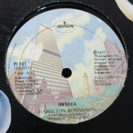「Let's Start The Dance」でお馴染みですね、USディスコプロデューサー/アレンジャー/コンポーザー Hamilton Bohannon によるアナザー・クラシックス12インチシングル盤。77年リリース。とにかくドス黒いグルーヴとサルソウルのような流麗なストリングス、そして天まで昇り詰めるかのような美しいピアノによるB「Andrea」が、なんといっても超キラー。ストンピンなグルーヴのファンク・チューンA「Bohannon Disco Symphony」も良曲。ディスコの持つ魅力を感じたいなら、この人は間違いないです。やはりディスコは週末が良く似合う。