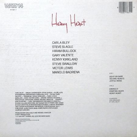 カリフォルニア・オークランド出身のピアニスト/コンポーザー Carla Bley の84年リリースの作品。ECM傘下のレーベル WATT Works から。Steve Swallow、Steve Slagle、Manolo Badrena、Kenny Kirkland、Michael Mantlerなどなどそうそうたるメンツが参加。柔らかいタッチによる女性らしいロマンシティズムと、どこか奇妙な感じのするユーモアのあるメロディメイクのピアノを軸としたフュージョン/コンテンポラリー・ジャズ。タイトなリズムと浮遊感のあるギター/シンセのA2「Talking Hearts」、軽やかなフルートに心躍るA3「Joyful Noise」、悲哀のメロディのオルガン/サックスが後半グルーヴィに展開していくB3「Heavy Heart」など全6曲。キャッチ―なメロディ・メイクと軽やかなグルーヴが音楽を「楽しい!」と感じさせてくれます。