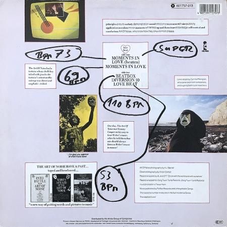 Trevor Horn 率いる音響芸術集団 Art Of Noise の誰もが耳にしたことのある名曲中の名曲12インチシングル盤。デビューアルバム 「(Who's Afraid Of?) The Art Of Noise!」からのシングルカット。やはりA1「Moments In Love (Beaten)」のセンチメンタリズムは半端じゃない。 Fairlight CMI (当時の価格で1200万もするという噂)という世界初のサンプラーによる実験的なサウンドコラージュでこの空気感を創り出すのは本当に凄い。本当の無音より静寂。シーケンス同じくメロディを半音下げてピアノが入る別曲B2「Love Beat」も美しすぎ。やはり Trevor Horn は天才です。
