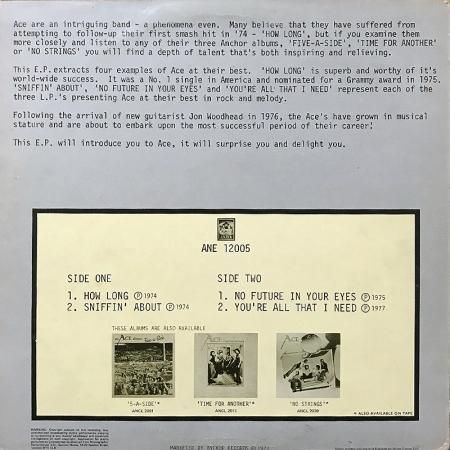 UKのSSW、Paul Carrack を中心に活動したロックグループ Ace の77年リリースの4曲入り後発12インチ・シングル盤。Aceのリリースした3枚のアルバムからのカット。やわらかいグルーヴが心地よいA1「How Long」はダンスフロアでもおなじみな1曲。後に Lipps.Inc もカヴァーしてました。「Long Train Runnin'」にも似たギターのカッティングの哀愁漂うB1「No Future In Your Eyes」も良曲。全4曲収録。アルバムよりも音が良い、というだけで買いですね。