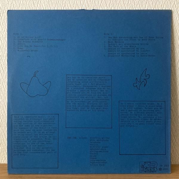 スウェーデンの謎グループ Imp Ink の80年作。これまた全くとらえどころのないレーベル Piglet records からのリリース。一説によると同レーベルからリリースもしているサックス奏者 Jonas Palm がメンバーという話も。クラウトのユーモアと陰鬱、フリージャズの混沌と暴力、プログレな展開、フォーキーな民族性などが混じり合い、コラージュ的に重なり合うダークでドリーミーなバッドトリップ的世界。一応セグメントごとにタイトルついてますが、全部繋がってますし、一気に聴くのが◎です。スリーヴのカラーも3種類あるようですが、今回は青で。フリージャズ特有の吹き出すような激情にグッときます。