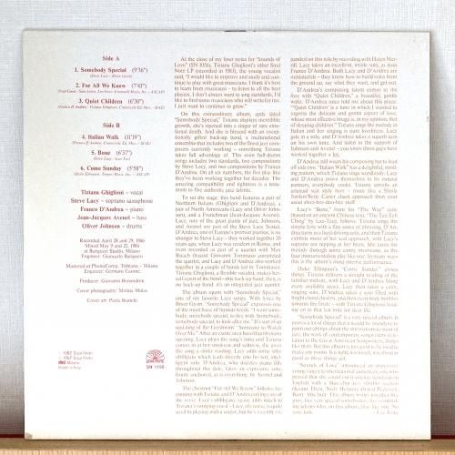 イタリアン・ジャズ界におけるファーストレディ的存在、ヴォーカリスト Tiziana Ghiglioni の87年作。Black Saint と共に知られる伊ジャズ名門 Soul Note から。USサックス奏者 Steve Lacy、共に活動するフランス人ベーシスト Jean-Jacques Avenel、USドラマー Oliver Johnson、伊ジャズピアニスト Franco D'Andrea のクィンテット編成、レーベルファウンダー Giovanni Bonandrini がプロデュース。