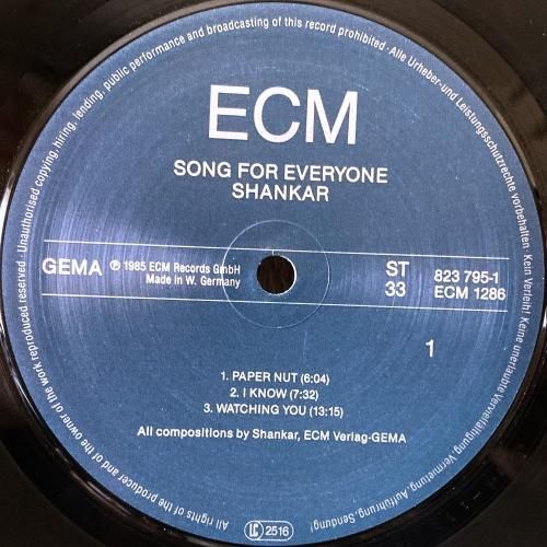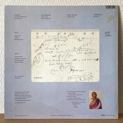 とはいえ1曲目に針を落とすと聴こえてくるドラムマシンにビックリしますが、リズムが単調だからこそ各演奏の本質が剥き出しになって凄みが増してます。Jan Garbarek の伸びやかなサックスが強烈A1「Paper Nut」、ダブルヴァイオリンの音色が狂気を帯びたように空気をうねらせるA3「Watching You」、倍速タブラのリズムの中をサックスとヴァイオリンが掛け合うB1「Conversation」、ゆったりとしたフロウと明るいメロディがピースフルに響くB2「Song For Everyone」など全7曲。