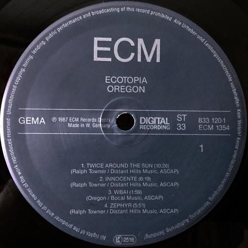 この作品以前の Oregon を知っている方からすれば、このシンセサイザーの大胆な導入っぷりに若干驚きますが、4人とは思えないほどの豊かなアンサンブルはそれ以前と何一つ変わらず。シンセの導入部から美しいアルペジオが入ってくる名曲A2「Innocente」、奇妙な世界に引きずり込まれるような4ビート・ジャズB2「Leather Cats」、ミニマルギターに Paul McCandless のセンチメンタルなソプラノ・サックスB3「ReDial」など全8曲。
