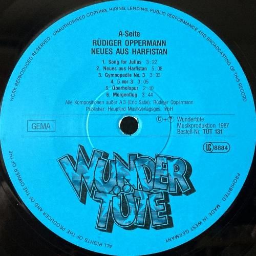 ギターでいうチョーキングのような装置が付いている特殊ハープを用いてのクリスタルな響きA2「Neues Aus Harfistan」、リズミカルなムビラと塩ビ管やグラスなどの繊細な打楽器アンサンブル、和音階ハープの無国籍フォークB4「Abendlied Des Trunkenen Fischers」、不安定な音階に方向を見失うB5「Requiem Für Günter Sare」など全11曲。