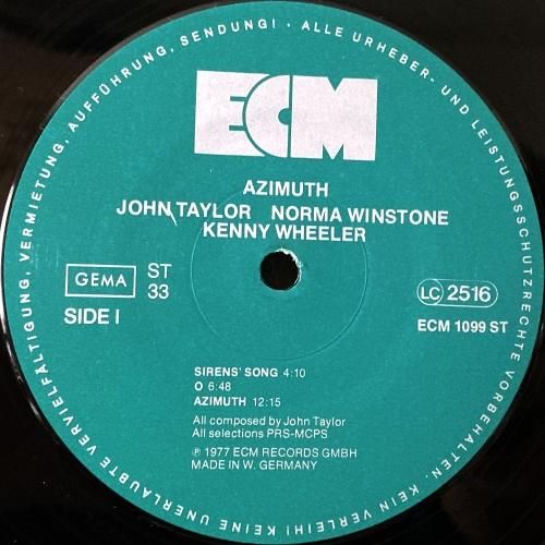 UK鍵盤奏者 John Taylor、ヴォーカリスト Norma Winston、トランペット/フリューゲルホーン奏者 Kenny Wheeler の3人によるトリオ・アンサンブル Azimuth の77年傑作。Talent Studio 録音、エンジニアはもちろん Jan Erik Kongshaug。