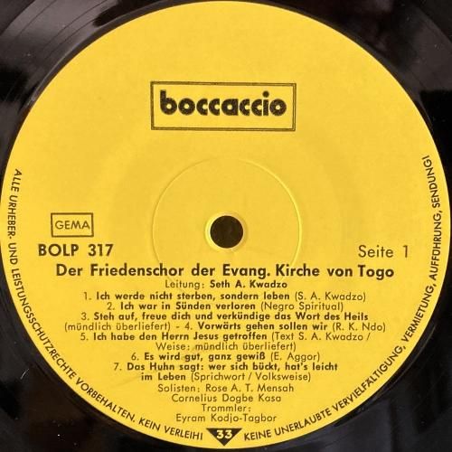 アフリカ西部に位置するトーゴ共和国のプロテスタント教会に所属する聖歌隊 Der Friedenschor Der Evang. Kirche Von Togo の作品。トーゴ共和国は数多くの民族が共存しているため、他のアフリカ音楽に比べても衣装や歌、踊り、リズムなどすべてにおいて個性的なのが特徴。