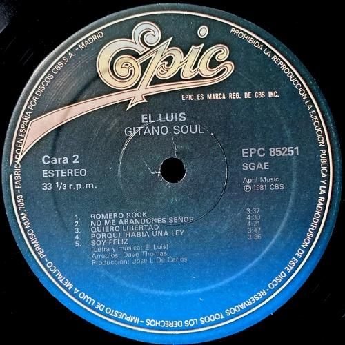 浮遊するベースと張りのあるフレームドラムによるリズムに、伸びやかで力強いヴォーカル聴かせるスパニッシュルンバA3「Perdóname Mi Vida」、幻想オルガンとエモーショナルなサックスA5「Gitano Juan」、気怠いコーラス混じるB2「No Me Abandones Señor」など全10曲。男臭くも品の良さ溢れるヴォーカリゼーションによるスペインの情熱。スペイン盤オリジナルプレス。