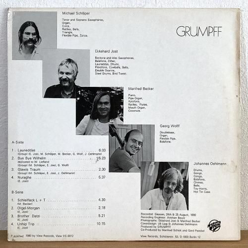 大学の名誉教授でもあるサックス/打楽器奏者 Ekkehard Jost、ベーシスト Georg Wolf、打楽器奏者 Johannes Oehlmann、鍵盤奏者 Manfred Becker、サックス奏者 Michael Schläper の独クィンテット・グループ Grumpff の80年作。メンバーのほとんどが併せて打楽器の演奏もこなすエスニック・フリージャズ・アンサンブル。
