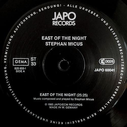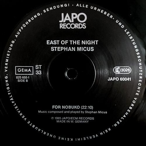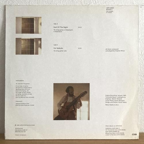 ECM独特の深いリヴァーブの音場を自ら考案した多弦ギターと尺八によって演奏される、緊張感がありつつもたおやかで優しい空気感漂うエスニック・アンビエント・ミュージック。河野玉水氏製作の尺八による優しいメロディとギターによるレイヤーがスリーヴの山々の濃淡のように奥行きを創り出すA「East Of The Night」、14弦ギターによる繊細な表現B「For Nobuko」の全2曲。Stephan Micus の作品の中でも際立ってシンプルだからこその「凛」とした空気。あふれ出る音楽観に浸る1枚です。