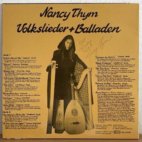 ドイツで活動するUSハーピスト Nancy Thym の作品。年代不詳。アイルランドやスコットランドなどイギリス民謡の研究をしてスコティッシュハープを演奏したり、独ケルト地方やノルウェーなどの伝統音楽におけるハープを研究/演奏するなど、豊富な博学と知見でアカデミックな活動を行う音楽家。