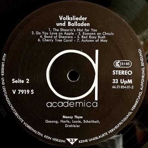 朴訥と爪弾かれるハープとエスニックな音階のスモーキーなヴォーカルA5「Two Sisters」、様々なカヴァーも多いイングリッシュトラッド名曲A6「Bonnie Black Hare」、優しく夢見なスコティッシュフォークB1「The Shearins Not For You」など全15曲。時にブルージーに、時にロマンティック、そして時には母性豊かに包みこむようなヴォーカリゼーションとハープの持つ高貴ながらも独特の哀感備えたサウンドのフォークミュージック。ドイツ盤オリジナル。