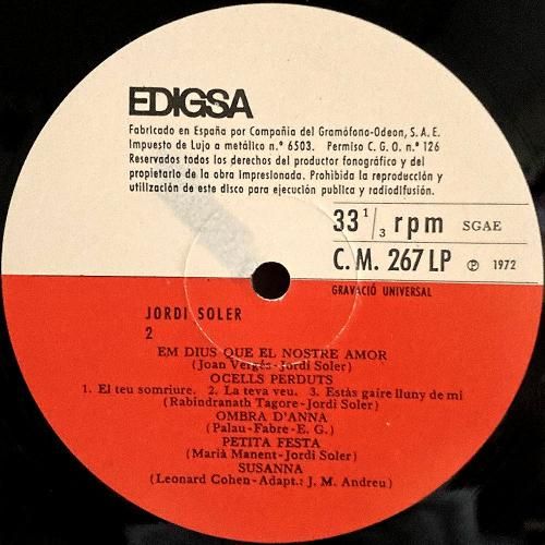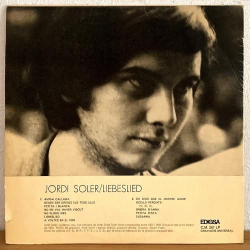 後の Toti Soler 名義での作品とは趣きが若干違い、どちらかといえばシンガーソングライター的な視点多めの楽曲群。展開ごとにグッとエモーショナルA4「No Em Val Haver Viscut」、スパニッシュなアルペジオA5「No Ploro Més」、Roberta Flack など多くのアーティストがカヴァーした Leonard Cohen の超名曲を味わい深く演奏するB5「Susanna」など全12曲。テクニカルな手腕をグッと抑え、朴訥としたピッキングと実直な歌が一際胸を打つ1枚。スペイン盤初期プレス。