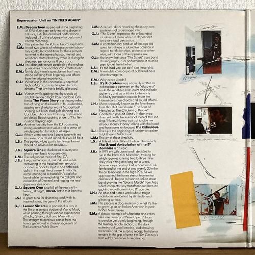 USパーカッショニスト John Bergamo、Larry Stein、Gregg Johnson、Frank Zappa のバンドに所属した Ed Mann の4人による打楽器アンサンブル Repeurcussion Unit の89年作。独良音レーベル CMP Records からのリリース。