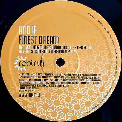 プロデューサー Philippe Lussan 率いるユニット And If の2002年リリース曲を、イタリアのレーベル Rebirth がライセンスしてリミックスを加えてリリース。2006年。リミックスは UK名門 Soma Quality Recordings からリリース多いグラスゴーの人気ユニット Silicone Soul。ラテンフィールな食い気味に走るグルーヴとヒプノティックに広がるエフェクティブなギターA1「Finest Dream (Original Instrumental Mix)」、腰にくるディスコなグルーヴと効果的にストリングスをループさせる匠の技B1「Finest Dream (Silicone Soul's Darkroom Dub)」など全3曲。大量のリリースに埋もれていながらも、ちゃんと光ってます。イタリア盤。