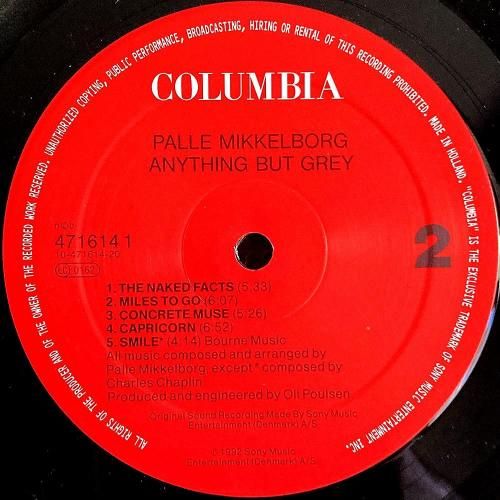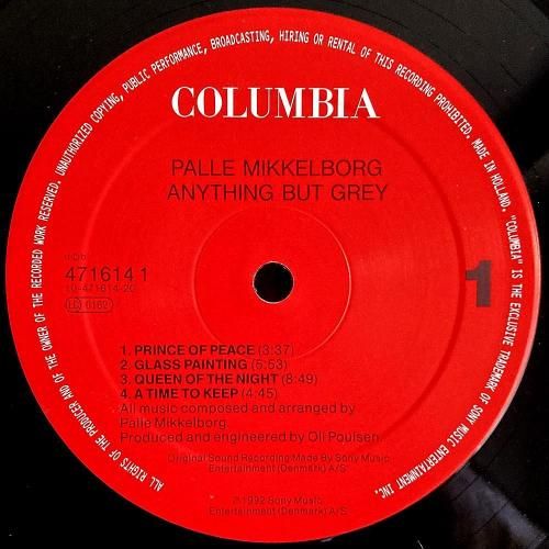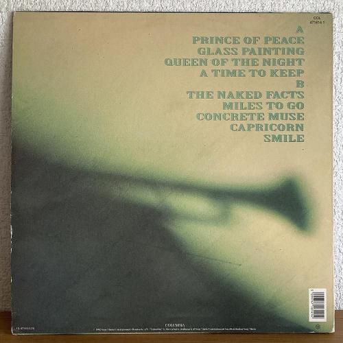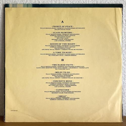歯切れ良いリズムとディストーション効くギター映えるA2「Glass Painting」、自身のシンセによるじんわり夢見なサウンドスケープにリリカルなトランペットが滲むA3「Queen Of The Night」、エスニックなマリンバでアフリカンな空気混じりつつも凛とした世界B1「The Naked Facts」など全9曲。Palle Mikkelborg らしいクールさとリリカルな演奏光る1枚。B2に小さくキズがあり周回プチノイズ入ります。若干ディスカウント。EU盤。