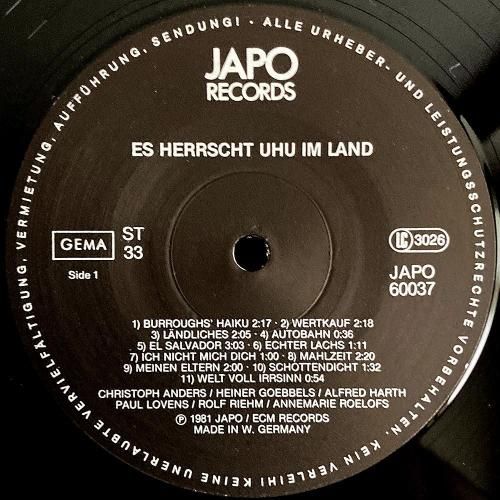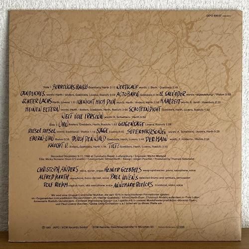 マルチ奏者 Heiner Goebbels、サックス奏者 Alfred Harth、ヴォーカル/ギター Christoph Anders、打楽器奏者 Paul Lovens、コルネット奏者 Rolf Riehm、トロンボーン奏者 Annemarie Roelofs というメンバーによるクセの強い1枚。81年作。ECM 傘下 Japo Records からのリリース。プロデュースは Thomas Stöwsand。