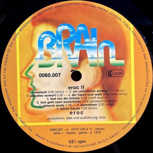 ドイツ70年代らしいアナログシンセの躍動、ミニマルなエレクトロニクス、カットアップ的編集、そして奇妙なユーモアが折り重なる奇怪な構成。リズムトラックがしっかり存在する曲もあれば、ほとんど環境音のように漂う断片的なパートもあり、実験性の中にも“聴けるバランス”が保たれているのが特徴。Eroc らしい遊び心が満載で、前衛的になりすぎない親しみやすさがあるあたりはドイツ産ならでは。
