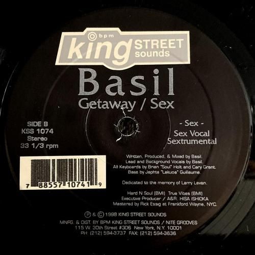 NY黄金期を支えたDJ/プロデューサー Basil(Basil Thomas) による1998年作。リリースはNY名門 King Street Sounds から。A1「Getaway (Legendary Club Mix)」は、煙たく妖しいアフロセントリックなムードと、ドロっとした地下感が漂う一曲。B1「Sex (Sex Vocal)」は、薄く“ドンピシャ”に決まるスネアと心地よいフルートが印象的ながら、その背後で渦巻く風のようなサウンドがどこか妖しくセクシャルに響きます。全4曲収録。いずれも Basil の語りが入るだけで雰囲気が一段階深まる、彼ならではの存在感が光る仕上がりです。US盤。