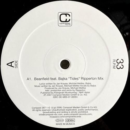 独ジャズ系レーベル Compost Recordings から、Jan Krause と Michael Mettke によるユニット Beanfield と、伊ソウルジャズグループ The Invisible Session の楽曲を収めたリミックス12インチ。2008年リリース作品です。A面には、気怠いヴォーカルにサイバーな質感のサウンドメイクを加えた Ripperton によるハメ系リミックス「Beanfield Feat. Bajka / Tides (Ripperton Mix)」。B面には、変則リズムで仕上げたジャズファンク寄りの「Invisible Session / Till The End (Panoptikum Instrumental Mix)」を収録。全2曲。ドイツ盤。