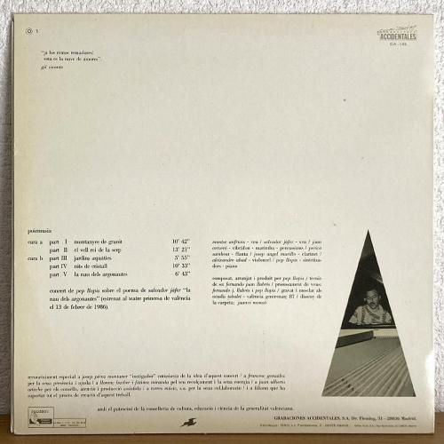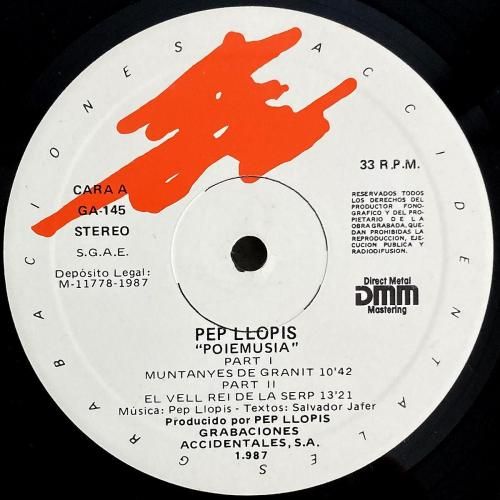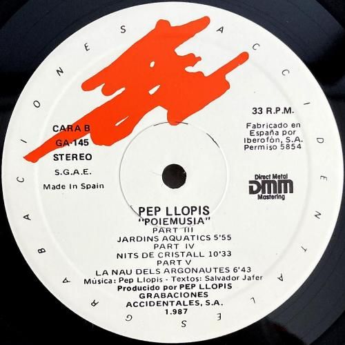 スペインの地中海に面したバレンシア自治州出身、70'sプログレグループ Coto-En-Pel で鍵盤奏者として活動した音楽家 Pep Llopis の87年作。スペイン屈指のインディペンデントレーベル Grabaciones Accidentales からのリリース。86年に行われた、詩人 Salvador Jofer の舞台のために制作された楽曲で構成されています。